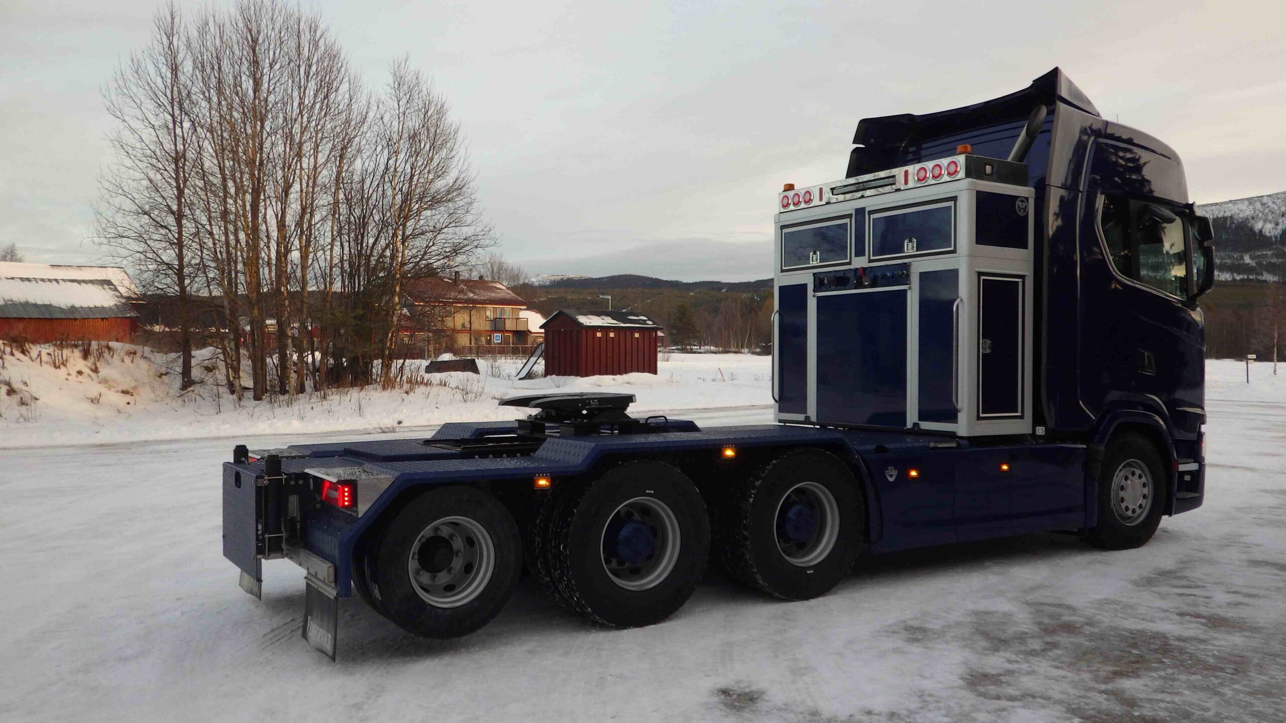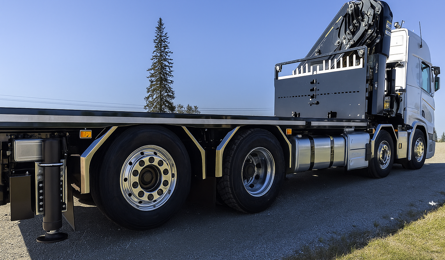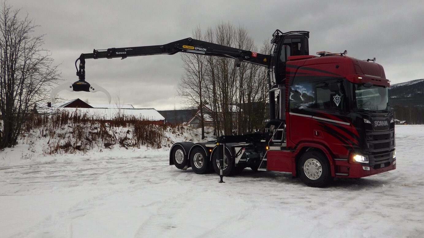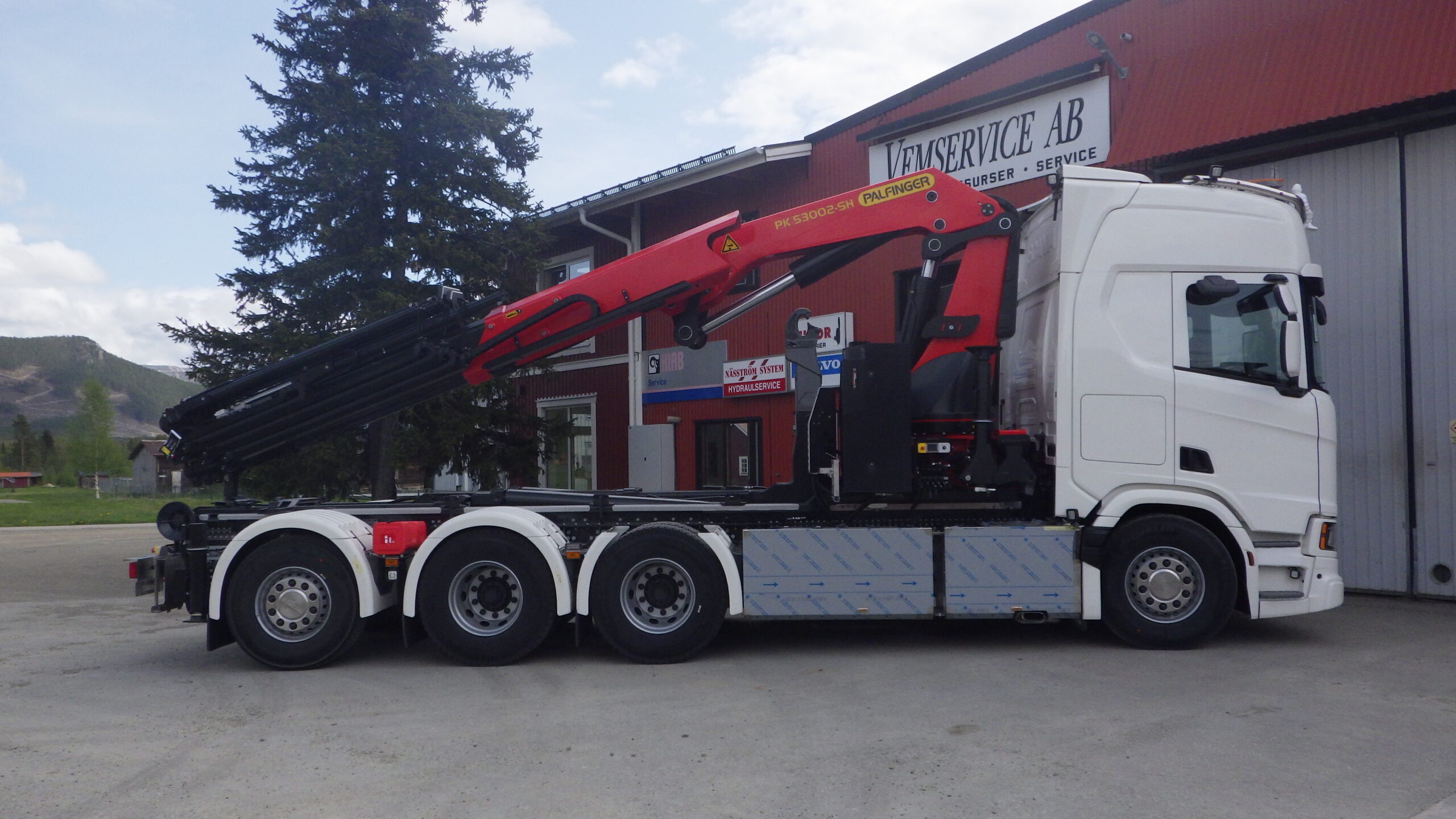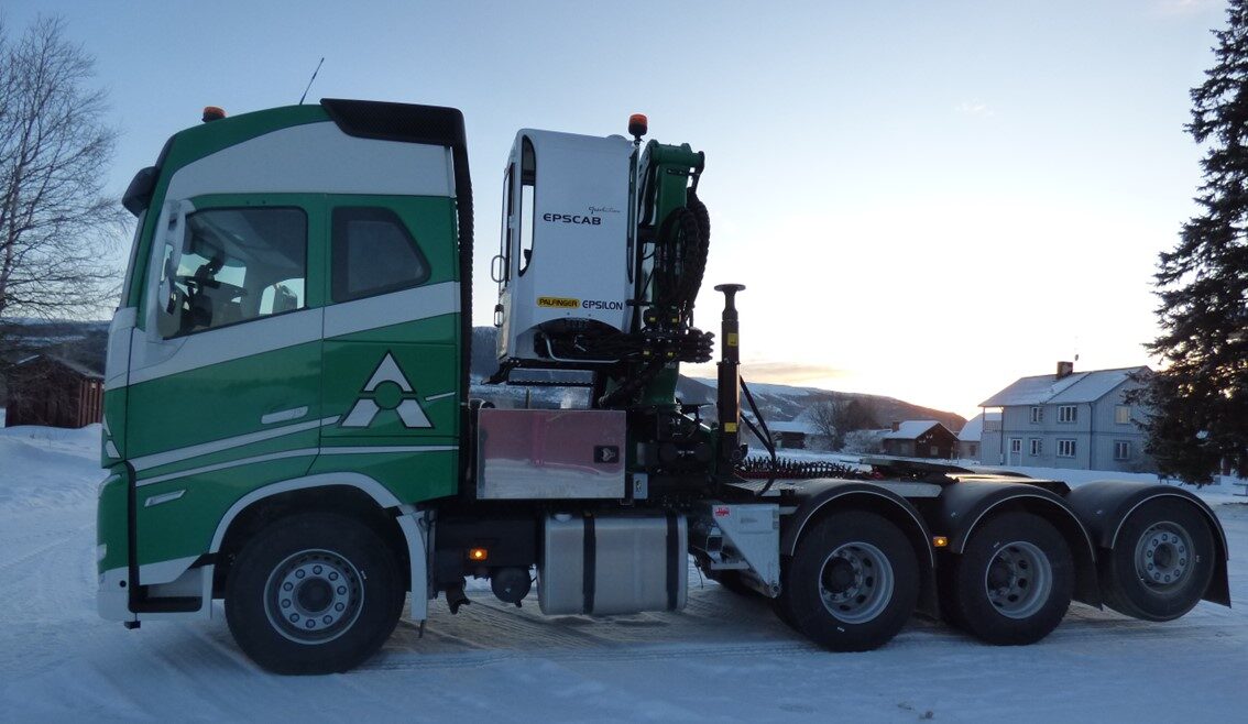 Volvo FH 8×4, Stolpbil, kran Palfinger Epsilon, Vändskiva Jost Protech 2″